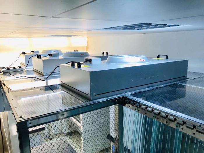 潔凈棚高效過濾單元2設(shè)置在風機1下方,與風機1緊密相連,高效過濾單元2可根據(jù)不同客戶的實際需要選擇不同的凈化級別,在高精科技的生產(chǎn)研發(fā)中,比如在半導體工業(yè)中,一般采用凈化級別很高的PTFE超高效過濾器;