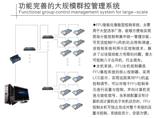 FFU群控系統(tǒng),主要用于大型潔凈房間,能夠方便地實現(xiàn)現(xiàn)場分散控制和集中統(tǒng)一管理功能??伸`活控制FFU風機的啟停和調速,該控制系統(tǒng)利用分區(qū)控制技術,解決了485驅動能力有限的問題,最大可控制幾千臺風機,F(xiàn)FU群控系統(tǒng),高等級凈化廠房使用。
