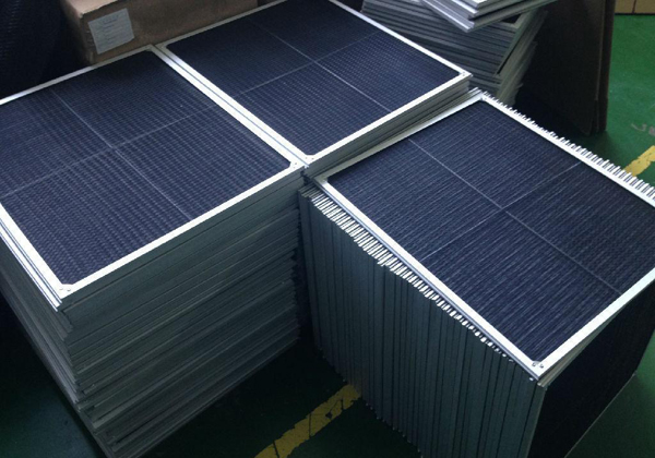 1)、采用初效無紡布平鋪于框架內(nèi),濾料雙面金屬網(wǎng)固定。