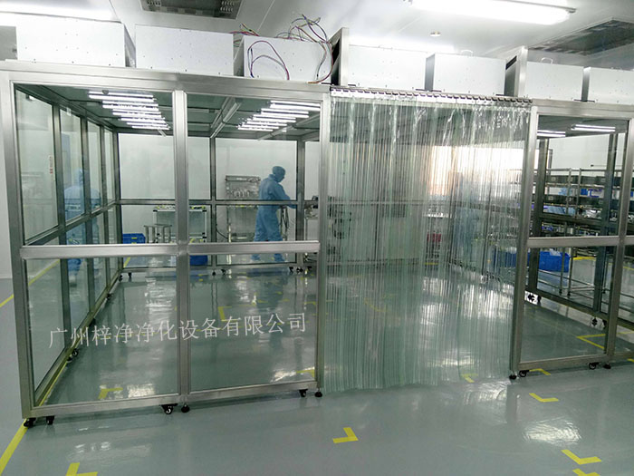 潔凈棚它主要從FFU頂部將空氣吸入,經(jīng)初效過濾器,高效過濾器過濾,過濾后的潔凈空氣在整個出風面以0.45m/s±20%的風速勻速送出到潔凈棚內(nèi)。形成均流層,使?jié)崈艨諝鈿饬鞒蚀怪眴蜗蛄鳎瑥亩WC了工作區(qū)內(nèi)所要求的潔凈度。潔凈棚等級通常分為百級潔凈棚,千級潔凈棚,萬級潔凈棚。