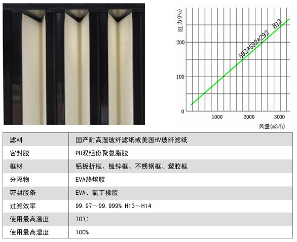 HV系列濾料是采用超細玻璃纖維制成的高密度紙,浦料褶登以盡量擴大派料的有效過濾面積,從而降低濾料的濾速,這對高效過濾器是相當重要的.進口H&V3波纖濾料具有防水性和阻燃性可適用于1000° F(538℃)的高溫,閉孔EVA密封墊片可用干氣密性密封,防止過濾器側(cè)漏,標準為18mm寬6mm厚。也可采用硅質(zhì)密封墊片,無隔板高效可使用聚氨酸發(fā)泡整體形成,發(fā)泡機走XY軸,自動運行,密封效果相當好。