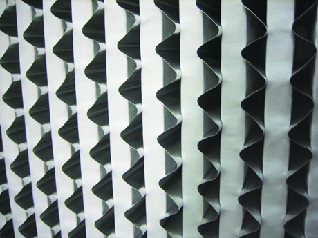 2.過濾器濾材兩面180°褶翻,折形成楔形褶層,濾料折彎時有兩道壓痕,使其在隔板的尾端開成楔形盒式褶層,楔形盒式褶層可以防止濾紙破損。